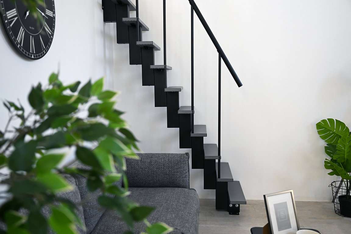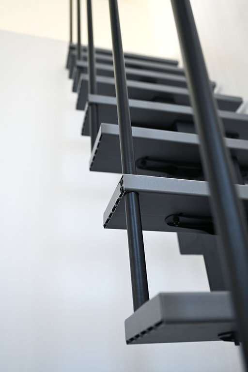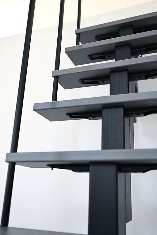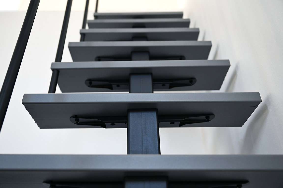 Ein besonderes Highlight der Mittelholmtreppe Happy ist die Möglichkeit, die Stufen in zwei Varianten zu montieren: entweder gerade oder leicht schräg versetzt. Diese Option verleiht der Treppe nicht nur ein modernes, sondern auch ein spielerisches Erscheinungsbild, das perfekt zu zeitgemäßen Wohnstilen passt. Das Grundgerüst besteht aus robustem, pulverbeschichtetem Stahl in klassischem Schwarz. Die Stahlstufen sind in den Farben Schwarz und Grau erhältlich.
