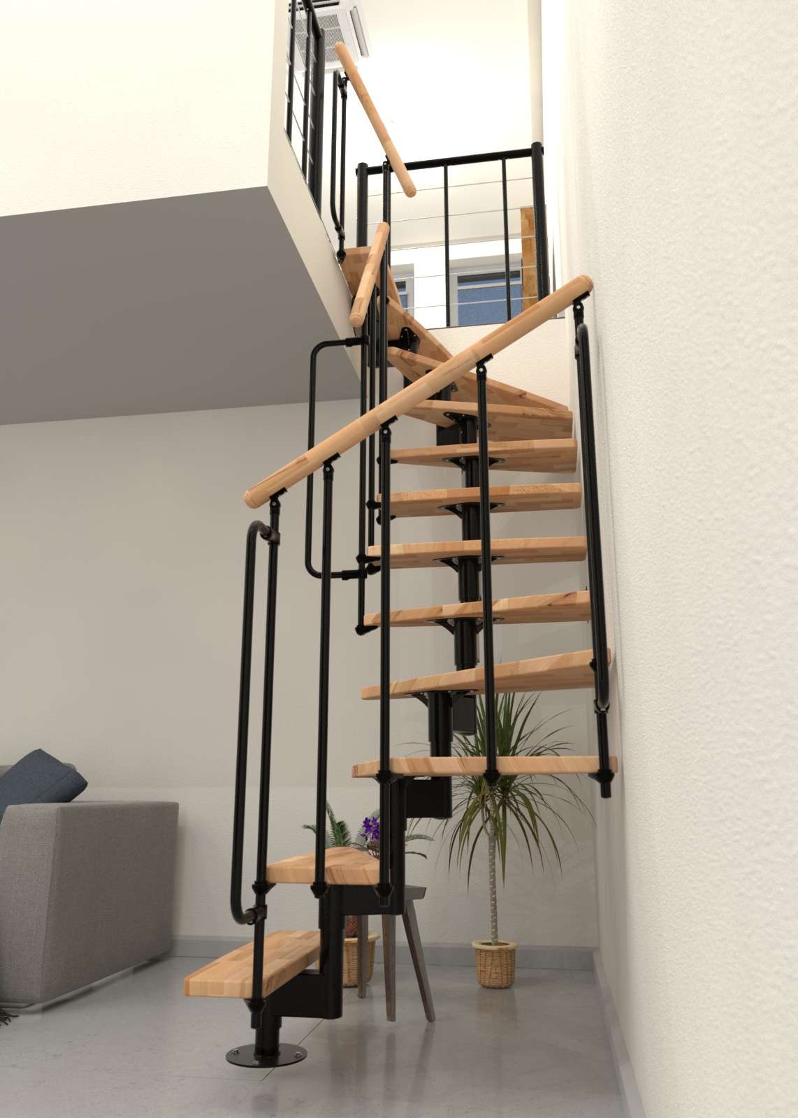 • Raumspartreppe mit Massivholzstufen und Geländer mit vertikalen Stäben