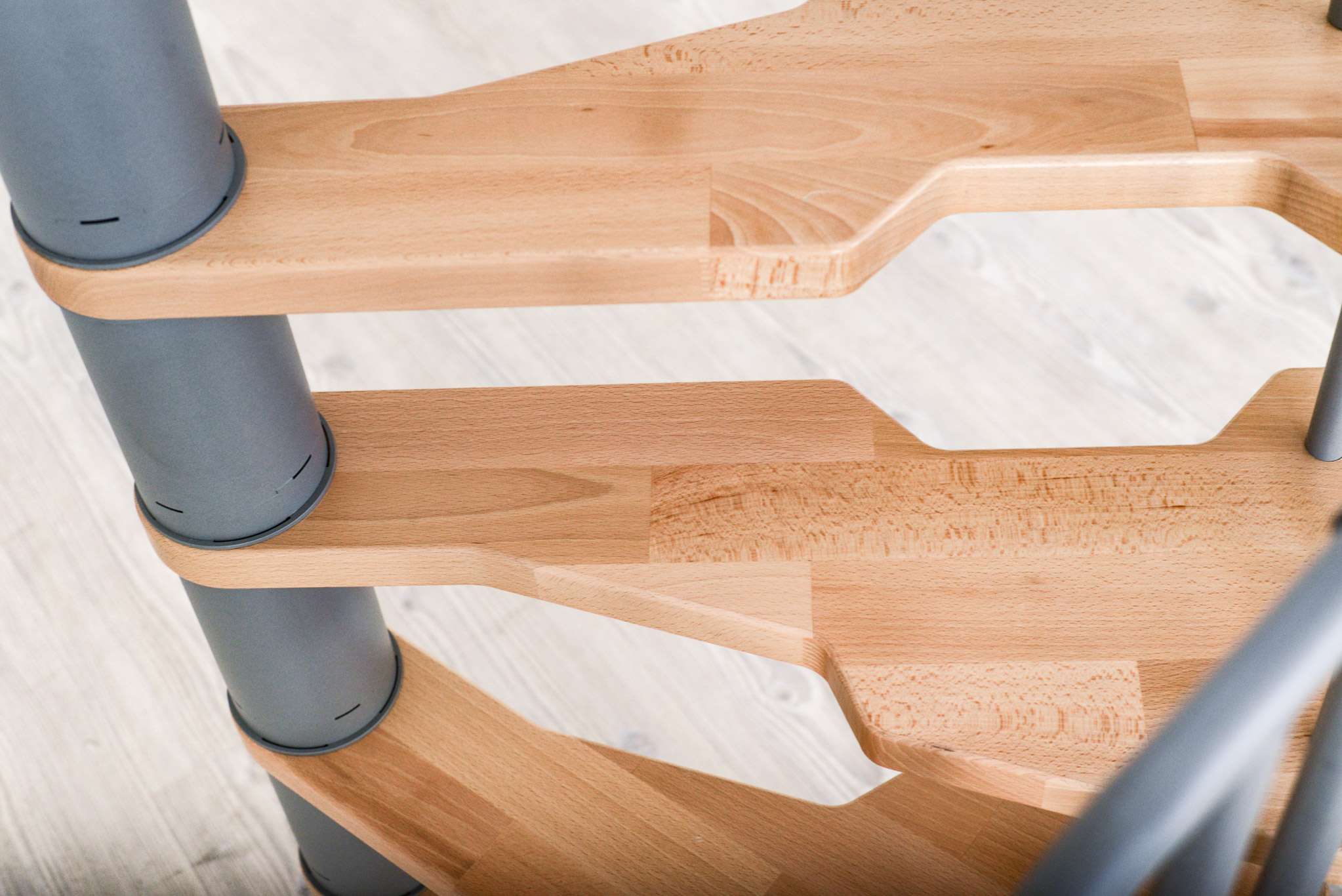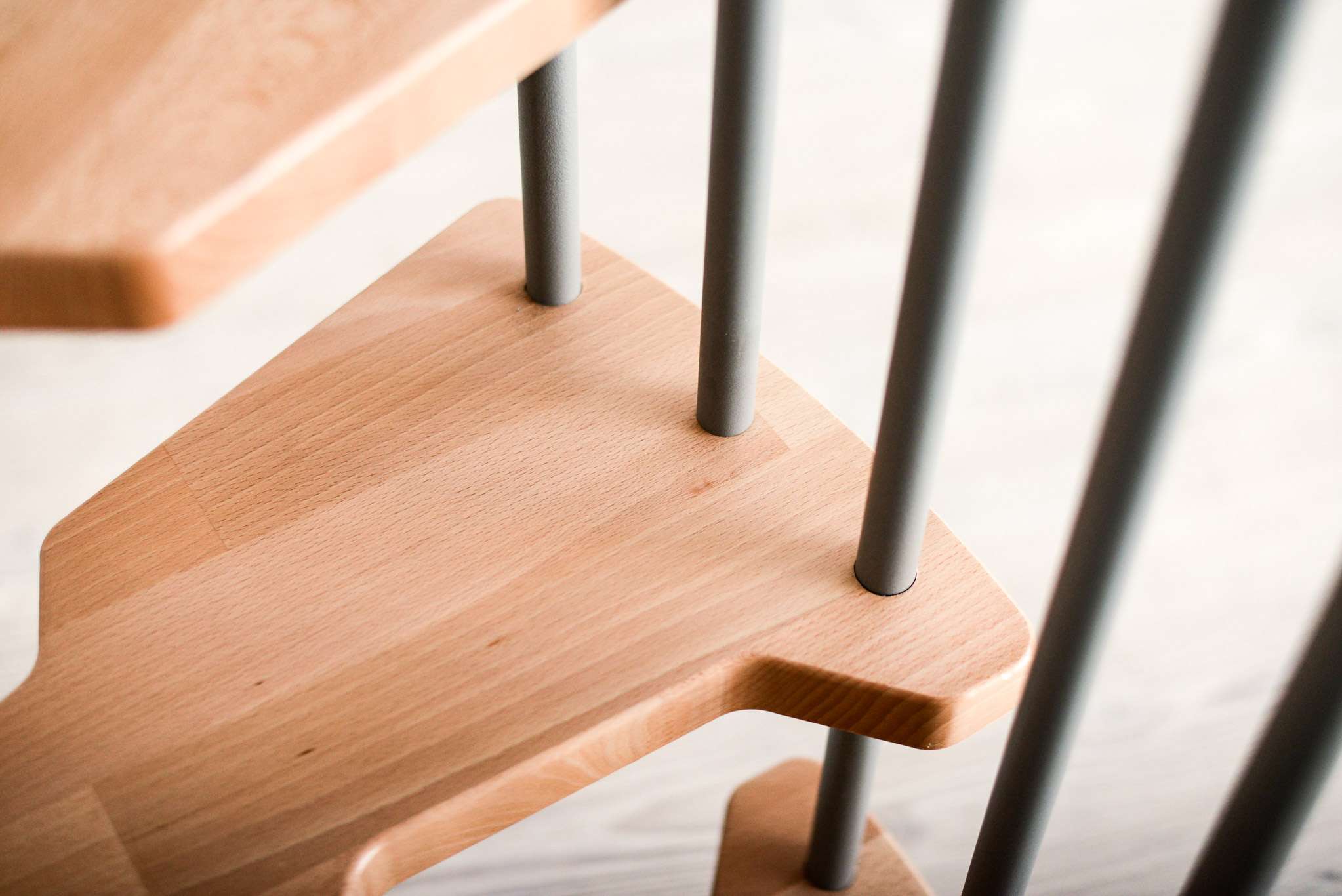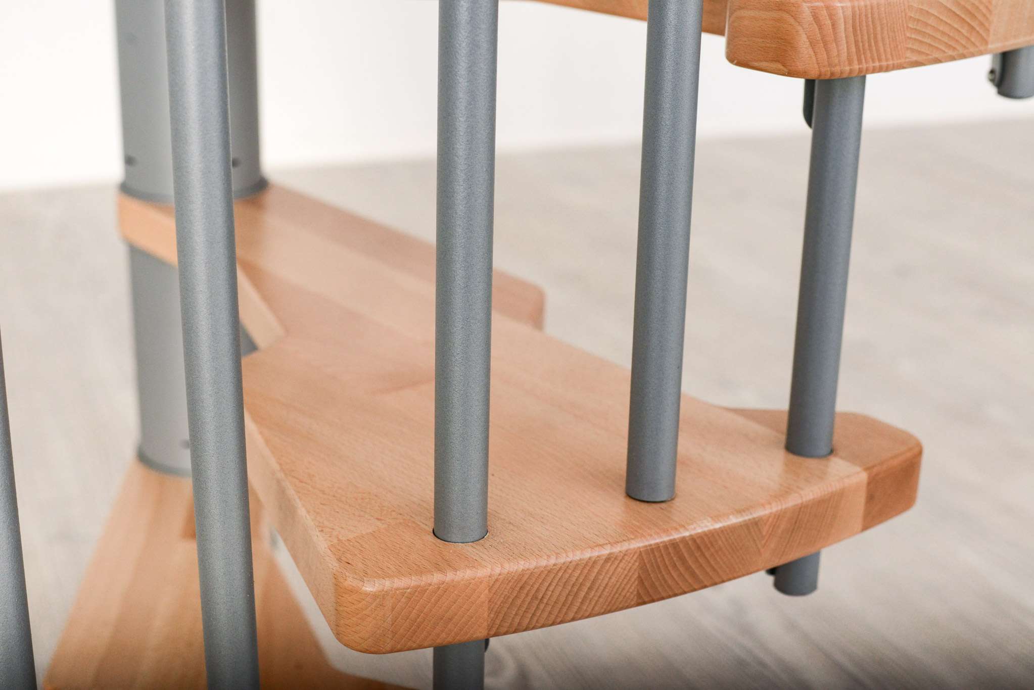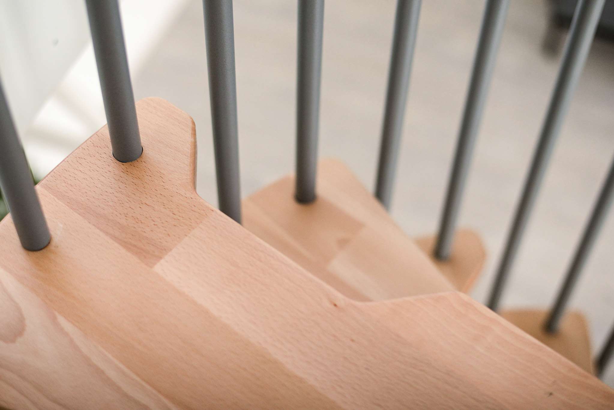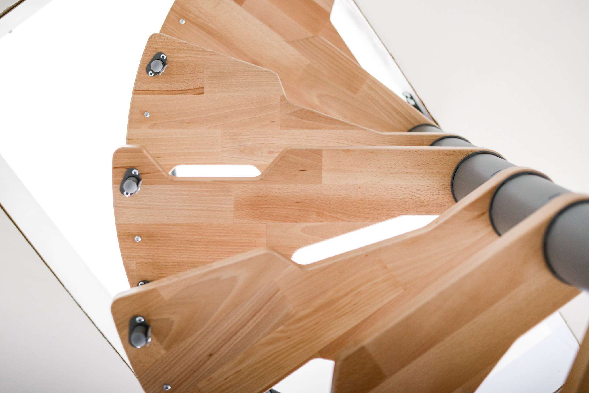 Die Stufen der Spindeltreppe Metallica bestehen aus massivem Buchenholz. Dieses ist zum Schutz und für eine noch hochwertigere Optik mit einer feinen Lackschicht überzogen. Für die Spindel und das Geländer stehen drei Farboptionen zur Auswahl: schwarz, grau und weiß. So können Sie Ihre Treppe an Ihr Interieur anpassen und einen harmonischen Look erzeugen.