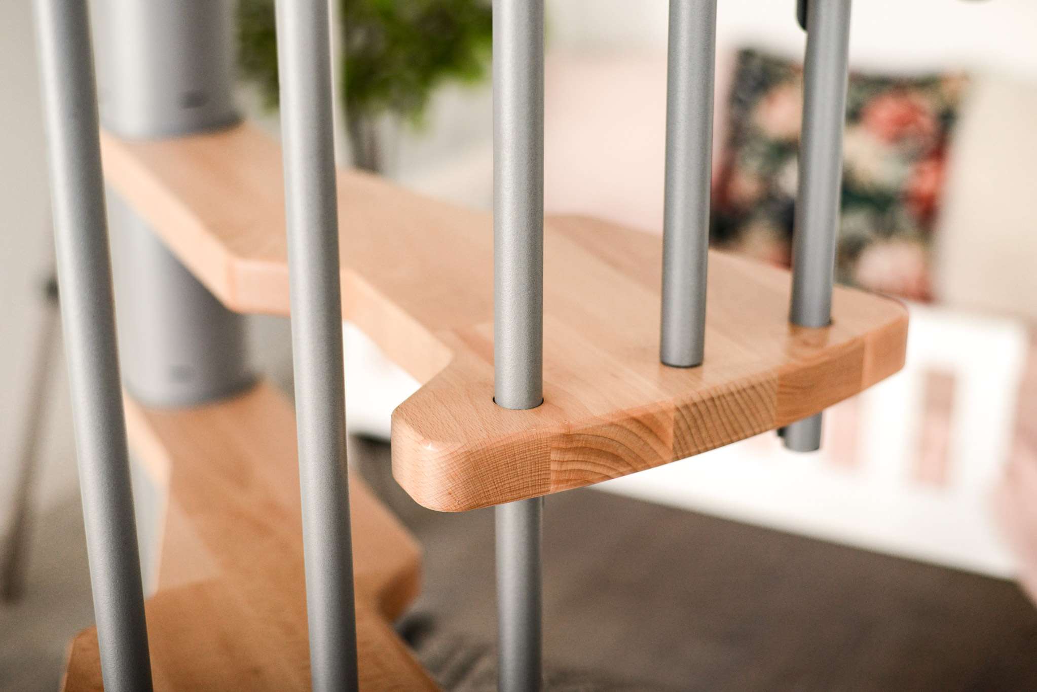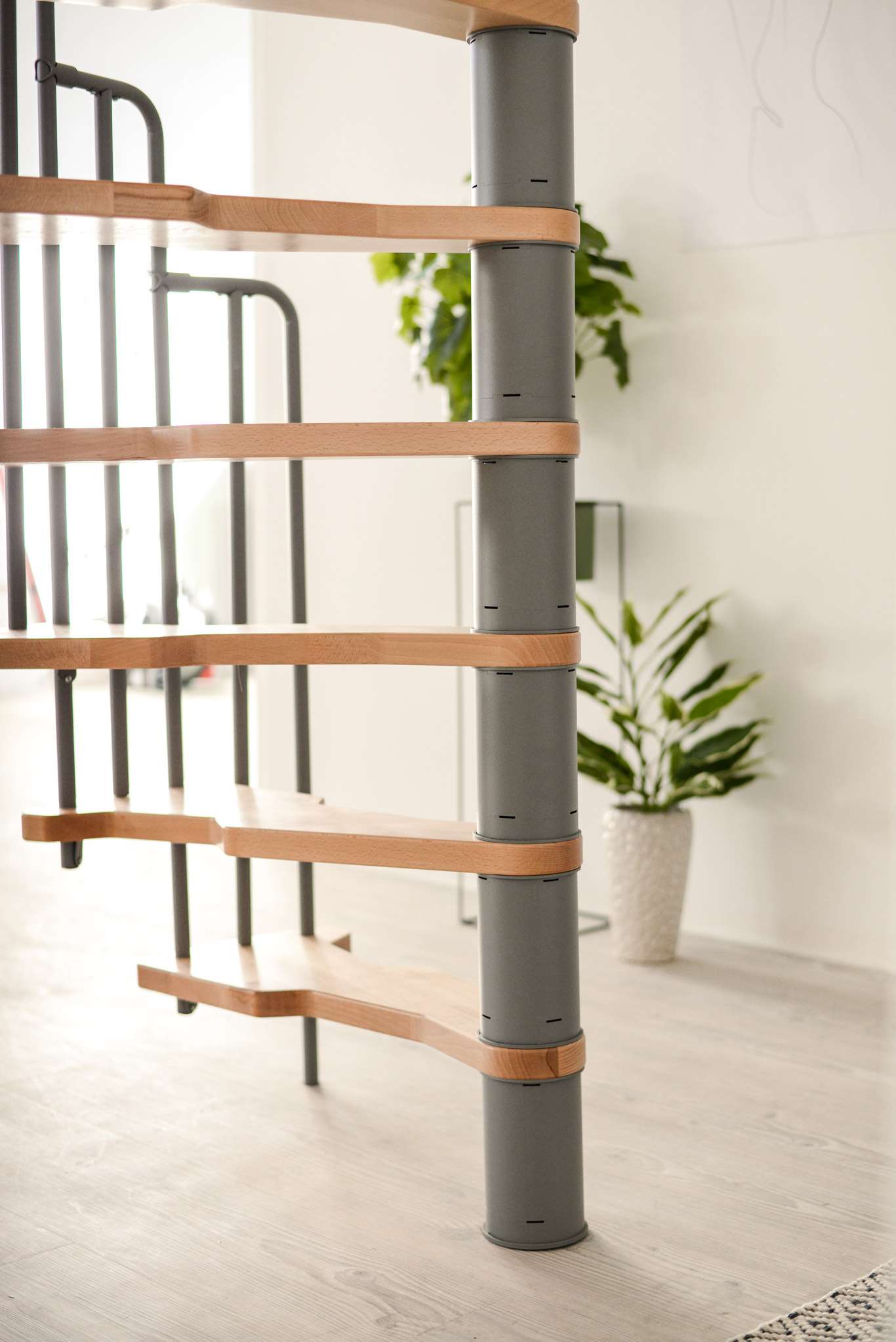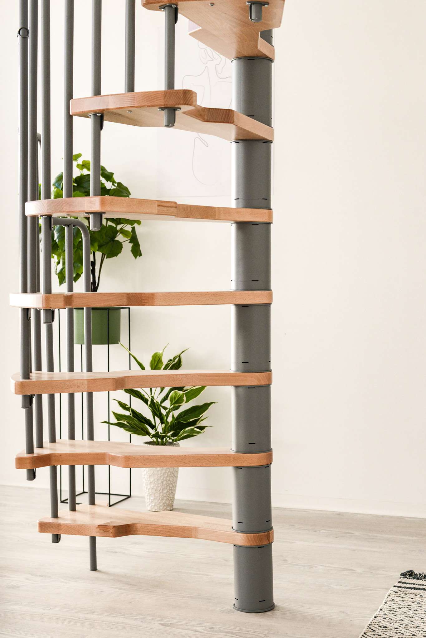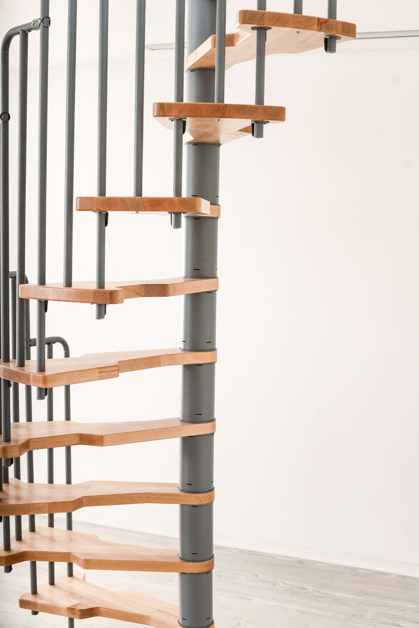 Die Stufen der Spindeltreppe Metallica bestehen aus massivem Buchenholz. Dieses ist zum Schutz und für eine noch hochwertigere Optik mit einer feinen Lackschicht überzogen. Für die Spindel und das Geländer stehen drei Farboptionen zur Auswahl: schwarz, grau und weiß. So können Sie Ihre Treppe an Ihr Interieur anpassen und einen harmonischen Look erzeugen.