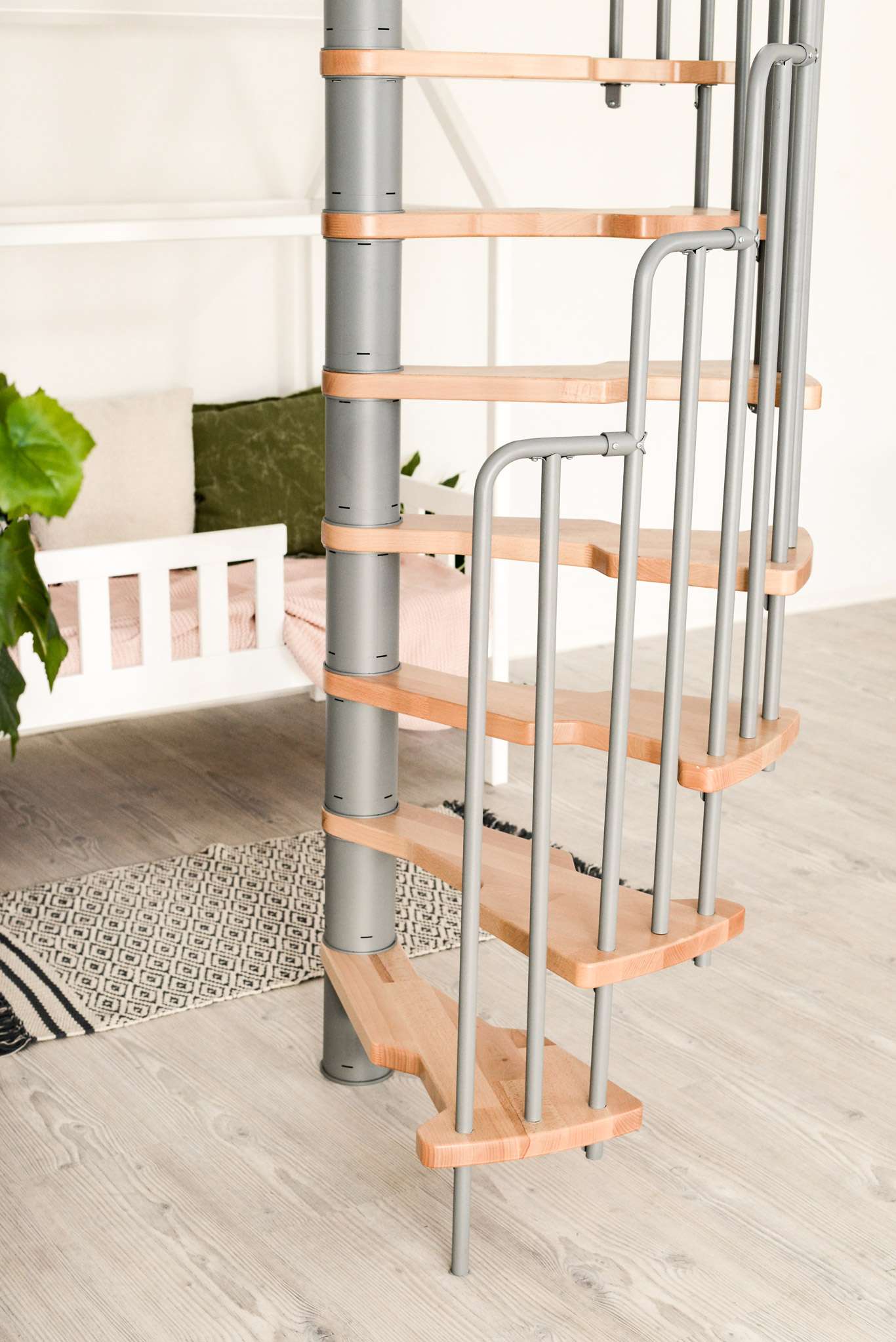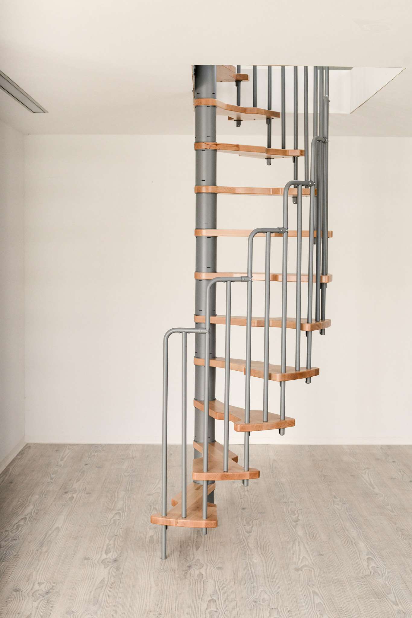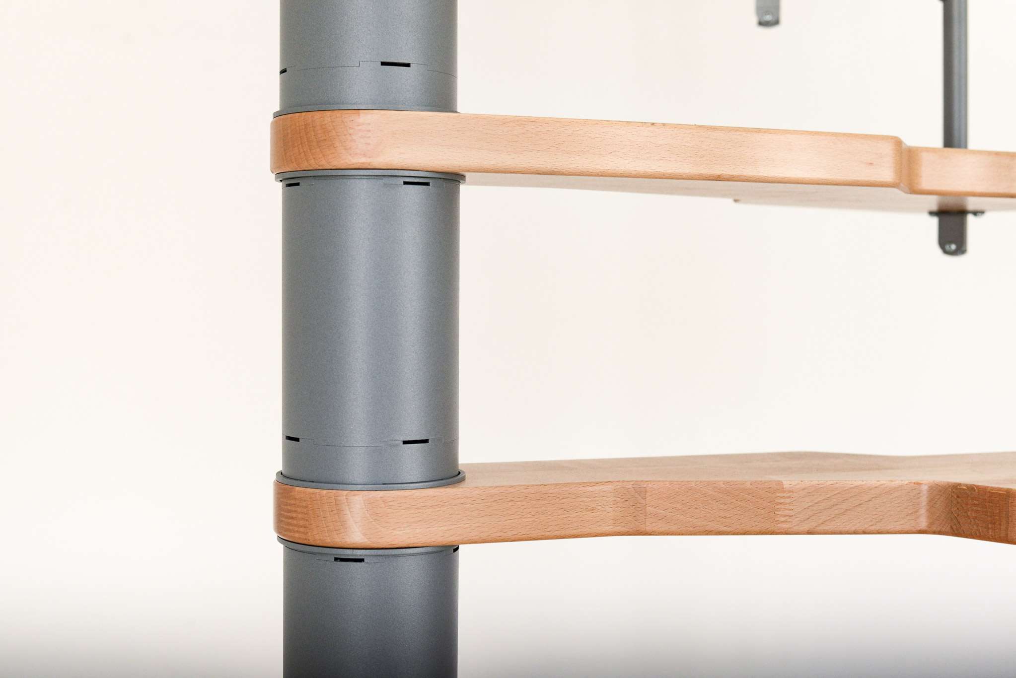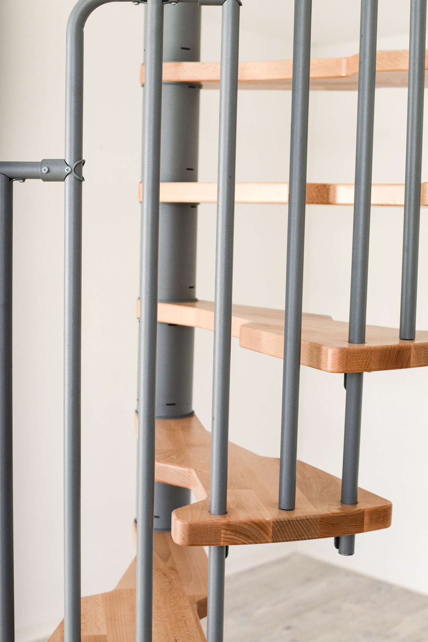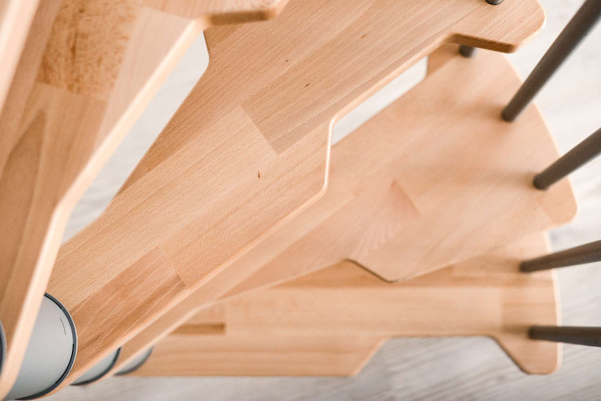Die Stufen der Spindeltreppe Metallica bestehen aus massivem Buchenholz. Dieses ist zum Schutz und für eine noch hochwertigere Optik mit einer feinen Lackschicht überzogen. Für die Spindel und das Geländer stehen drei Farboptionen zur Auswahl: schwarz, grau und weiß. So können Sie Ihre Treppe an Ihr Interieur anpassen und einen harmonischen Look erzeugen.