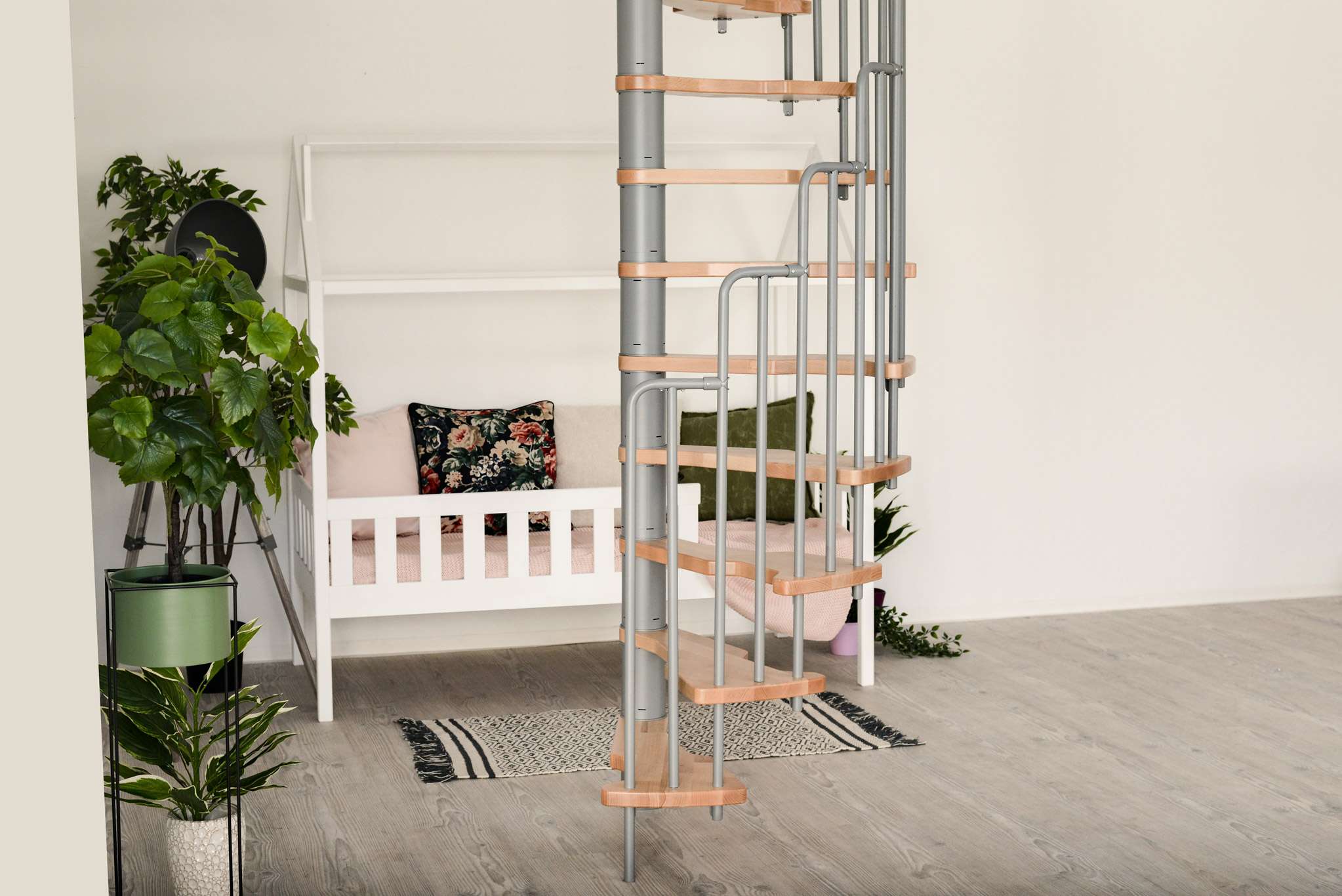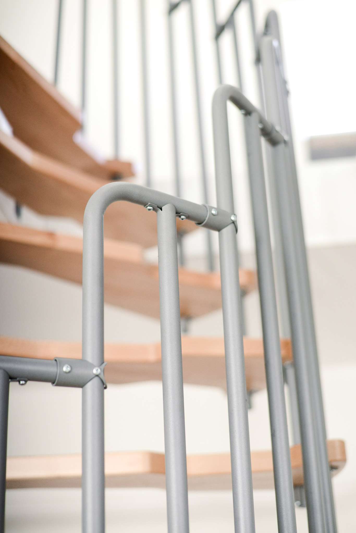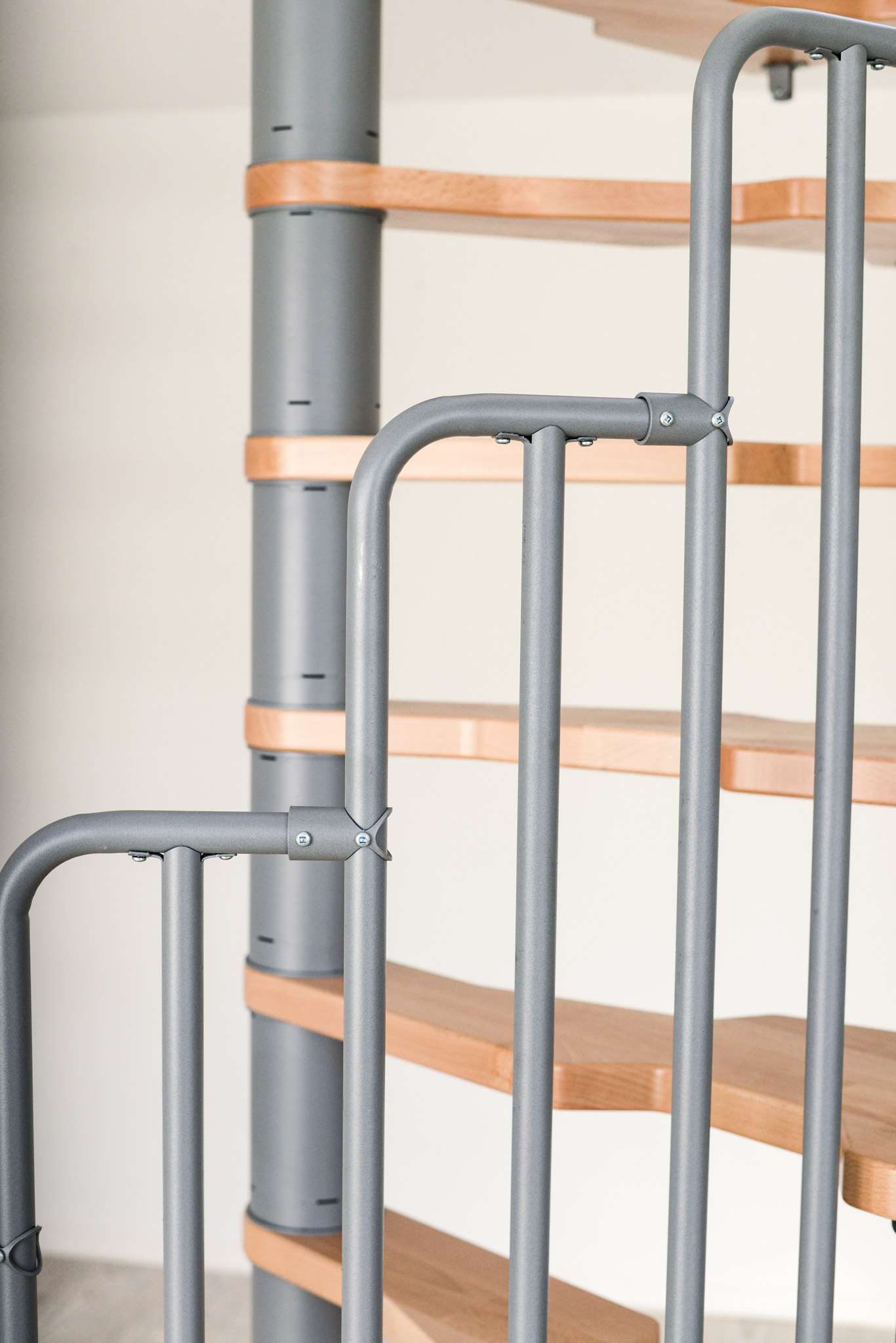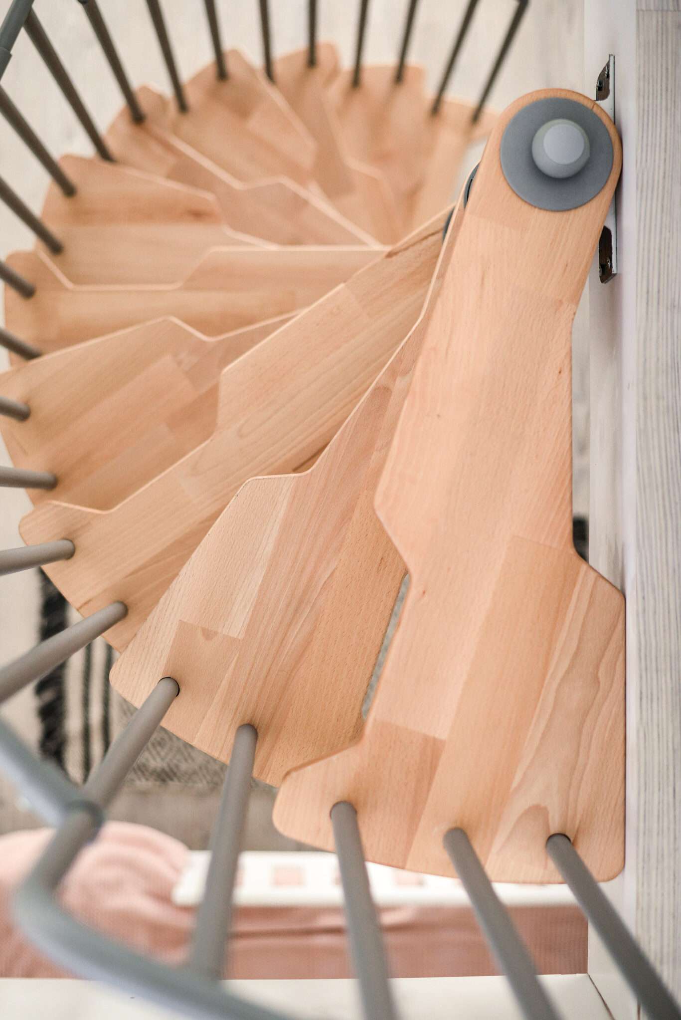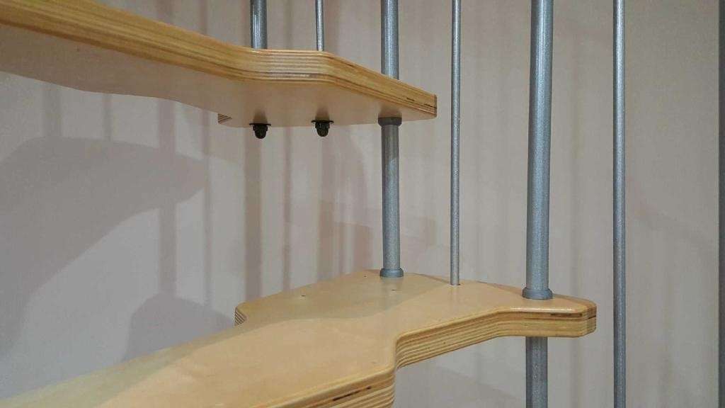 Die Stufen der Spindeltreppe Metallica bestehen aus massivem Buchenholz. Dieses ist zum Schutz und für eine noch hochwertigere Optik mit einer feinen Lackschicht überzogen. Für die Spindel und das Geländer stehen drei Farboptionen zur Auswahl: schwarz, grau und weiß. So können Sie Ihre Treppe an Ihr Interieur anpassen und einen harmonischen Look erzeugen.