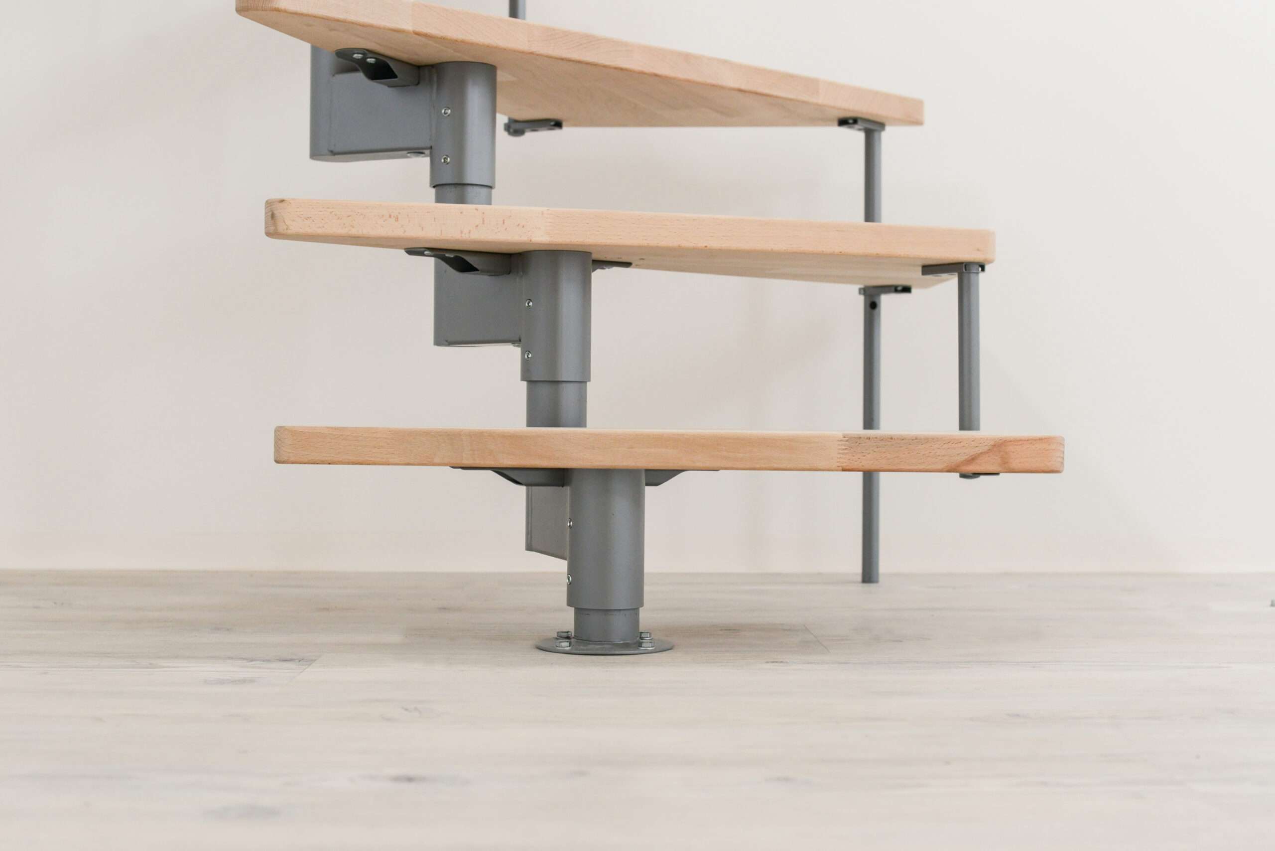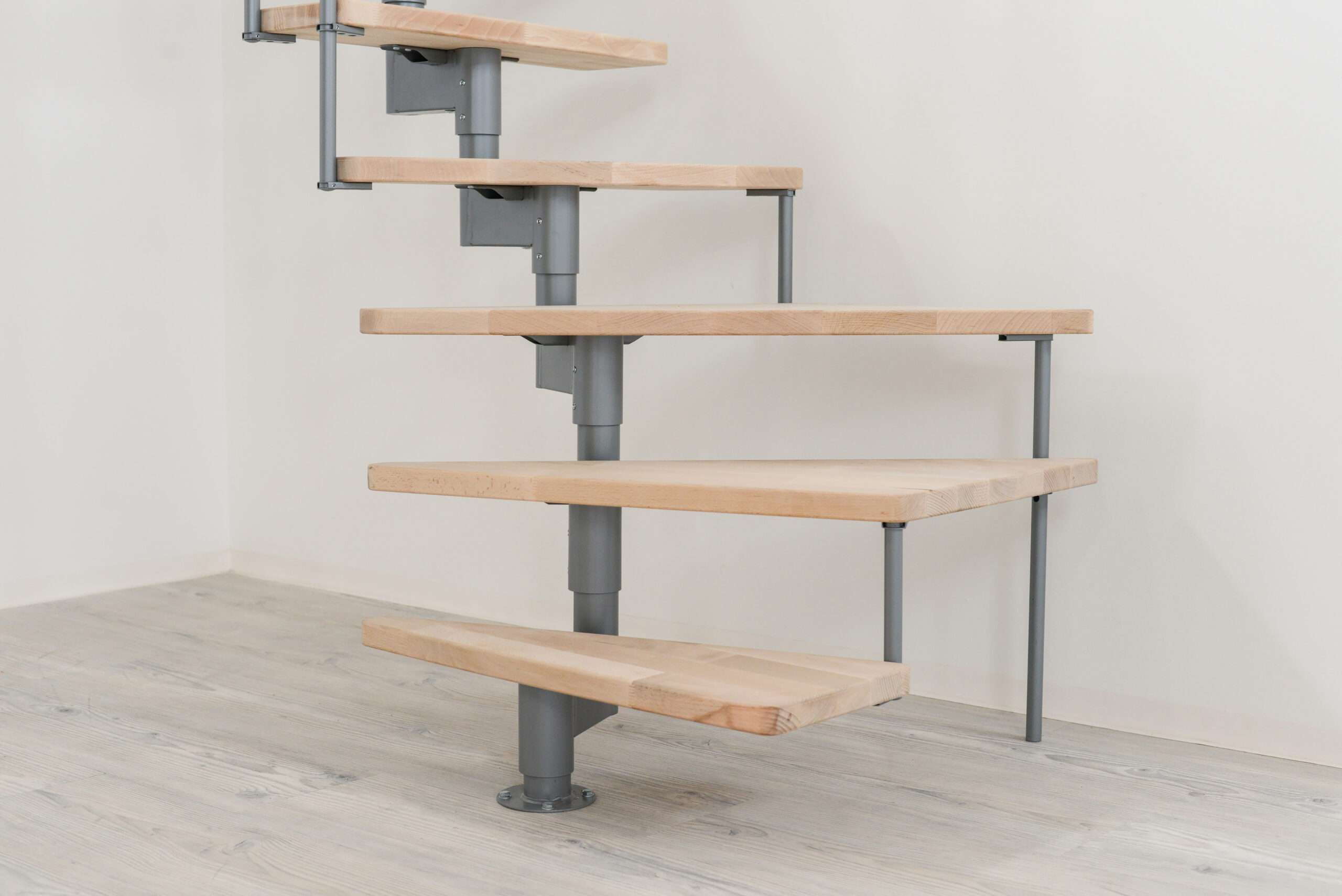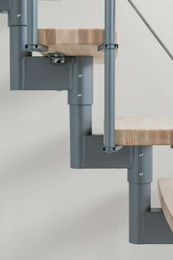Die Stufen der Style Turn bestehen aus massivem Buchenholz. Durch die Lackierung haben die Stufen einen leichten Schimmer, bewahren aber ihre natürliche und helle Optik. Wenn Sie einen etwas dunkleren Look bevorzugen, können Sie die Stufen auch auf eine edle Walnussoptik gebeizt haben. Bei der Farbe der Träger und des Geländers können Sie ebenfalls zwischen mehreren Varianten wählen: Zur Auswahl stehen Schwarz, Weiß und Grau.
