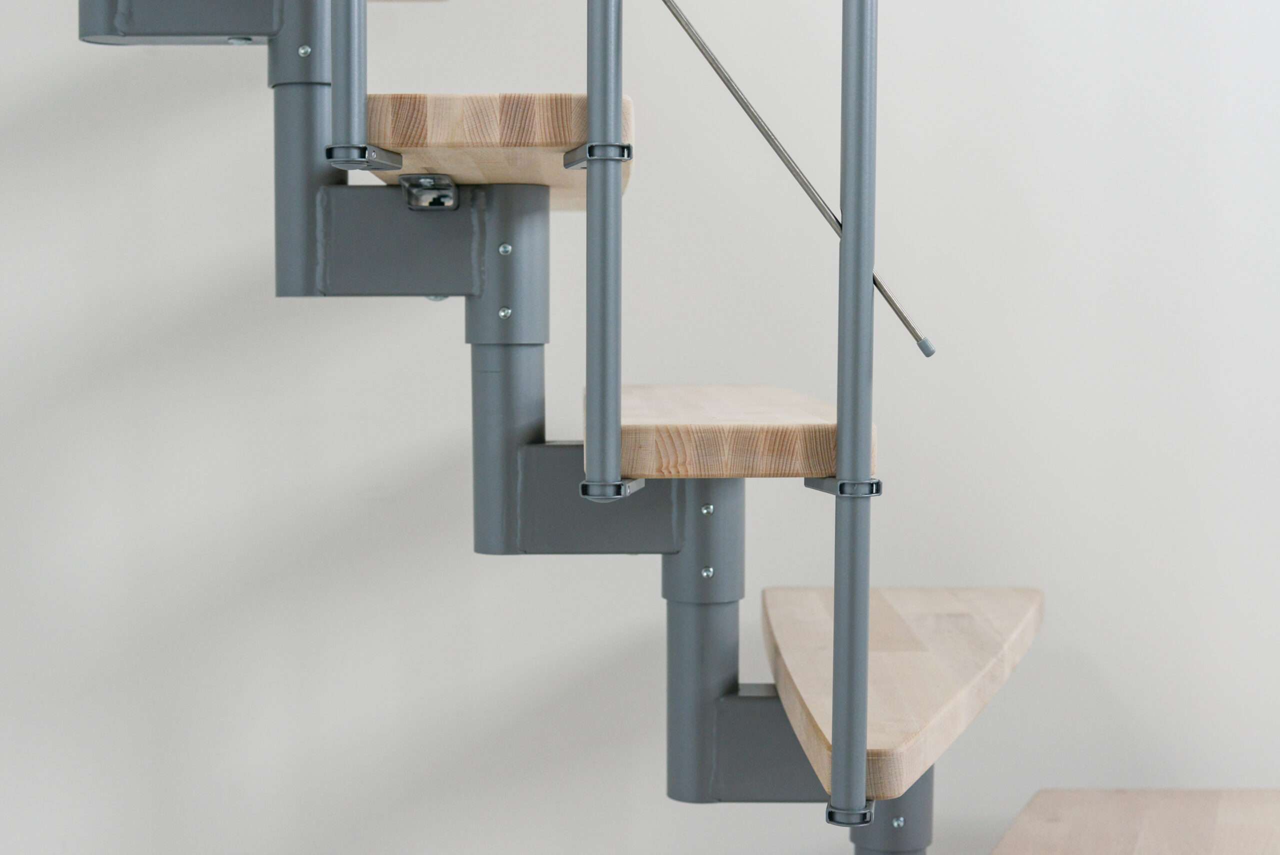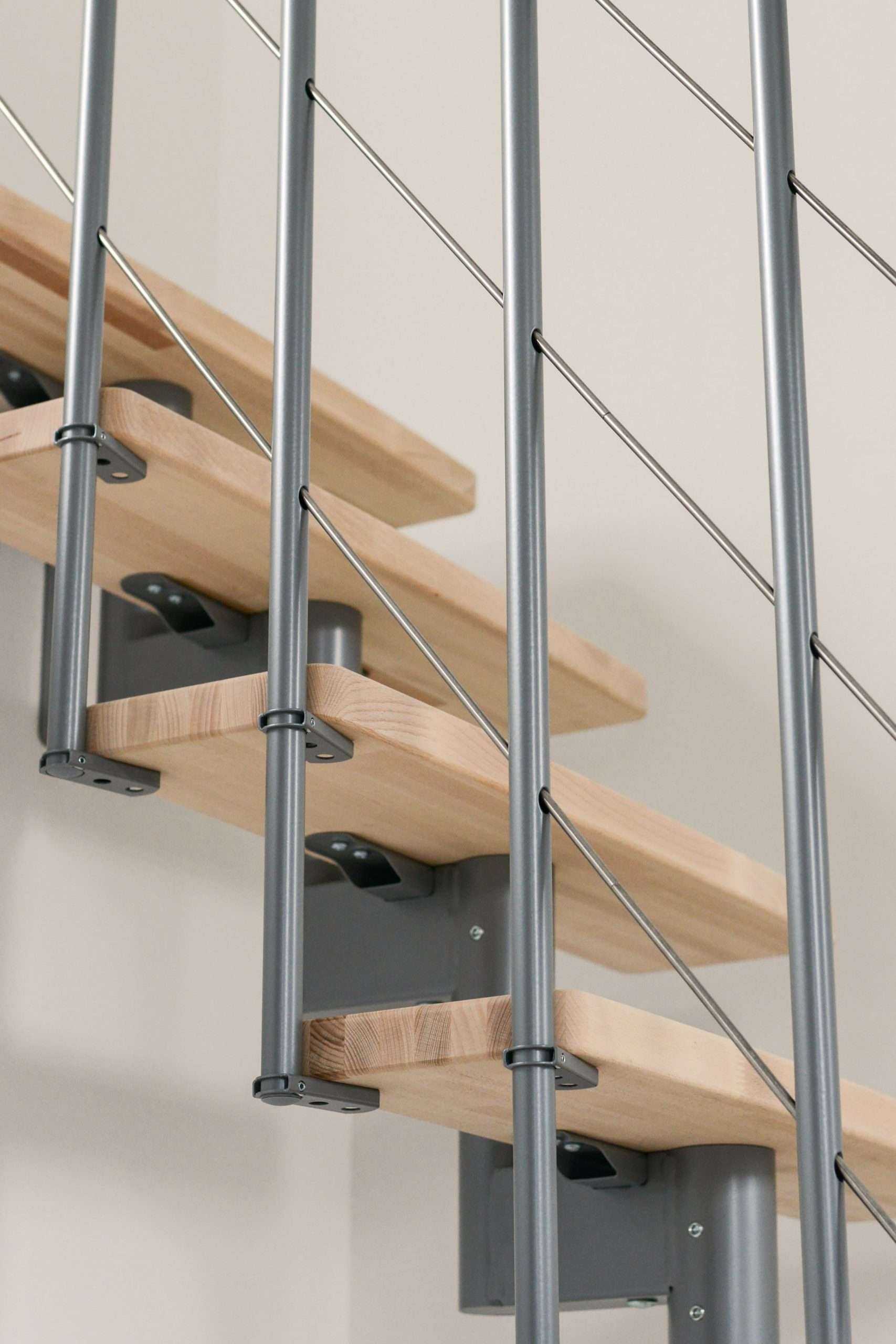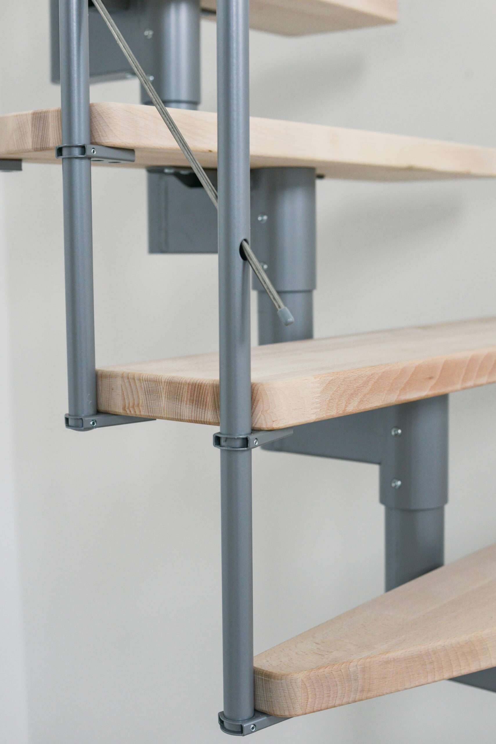 Die Stufen der Style Turn bestehen aus massivem Buchenholz. Durch die Lackierung haben die Stufen einen leichten Schimmer, bewahren aber ihre natürliche und helle Optik. Wenn Sie einen etwas dunkleren Look bevorzugen, können Sie die Stufen auch auf eine edle Walnussoptik gebeizt haben. Bei der Farbe der Träger und des Geländers können Sie ebenfalls zwischen mehreren Varianten wählen: Zur Auswahl stehen Schwarz, Weiß und Grau.