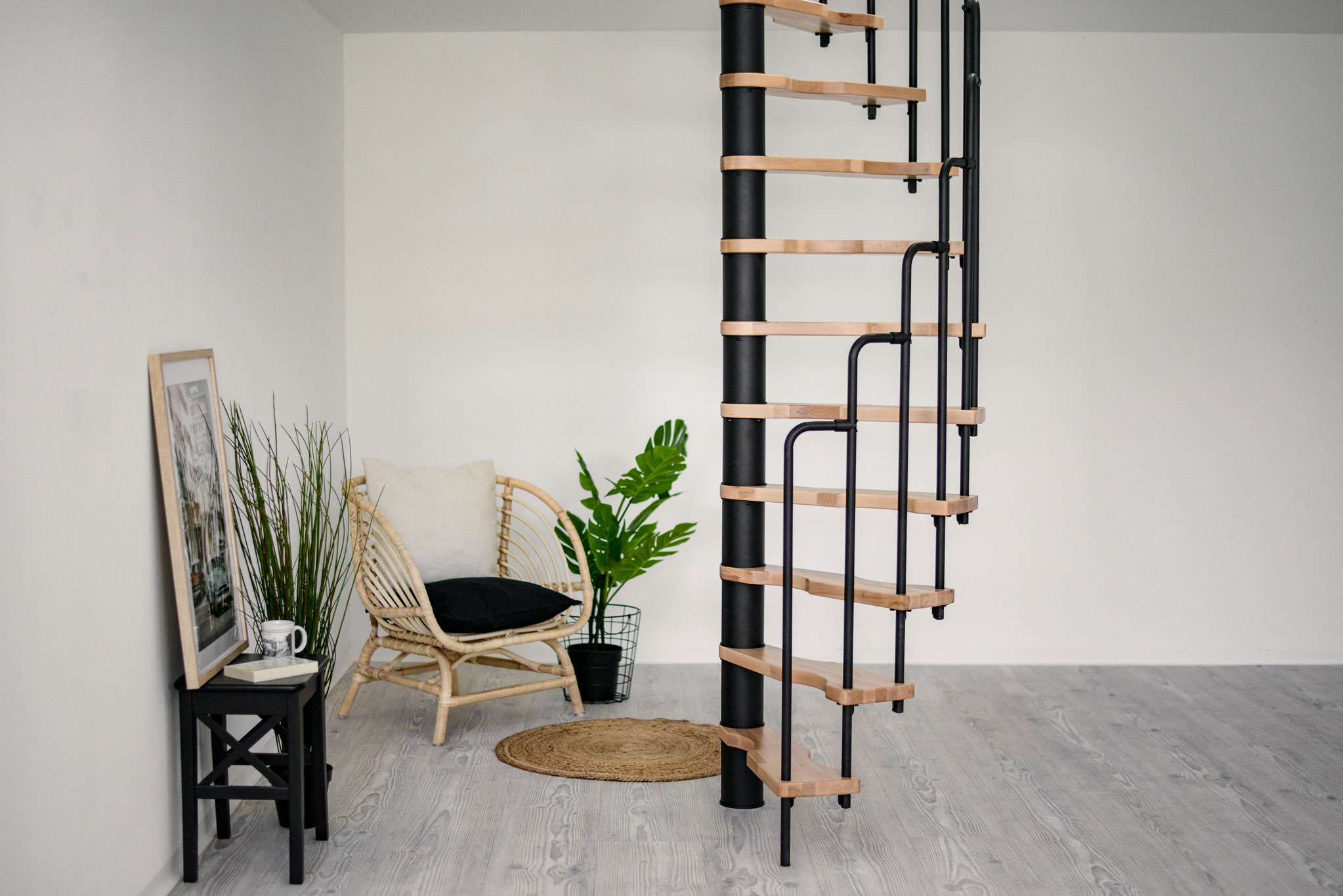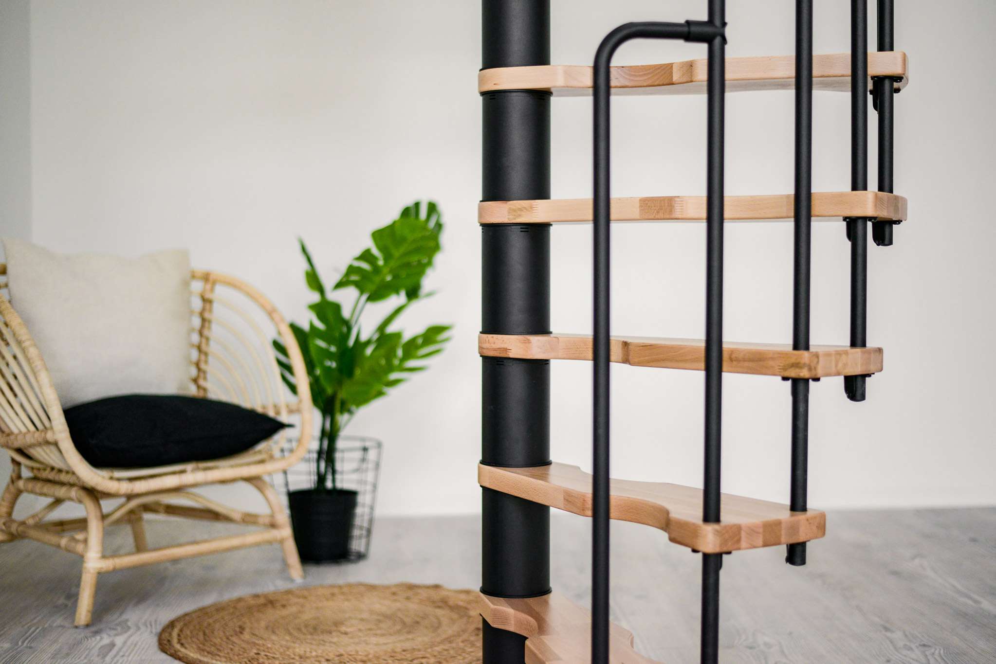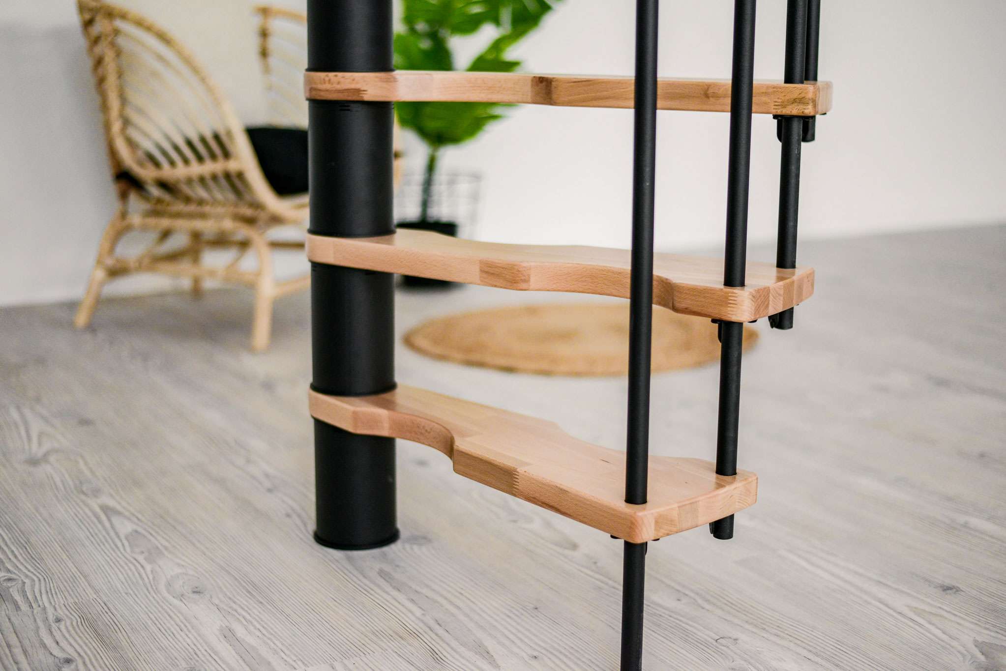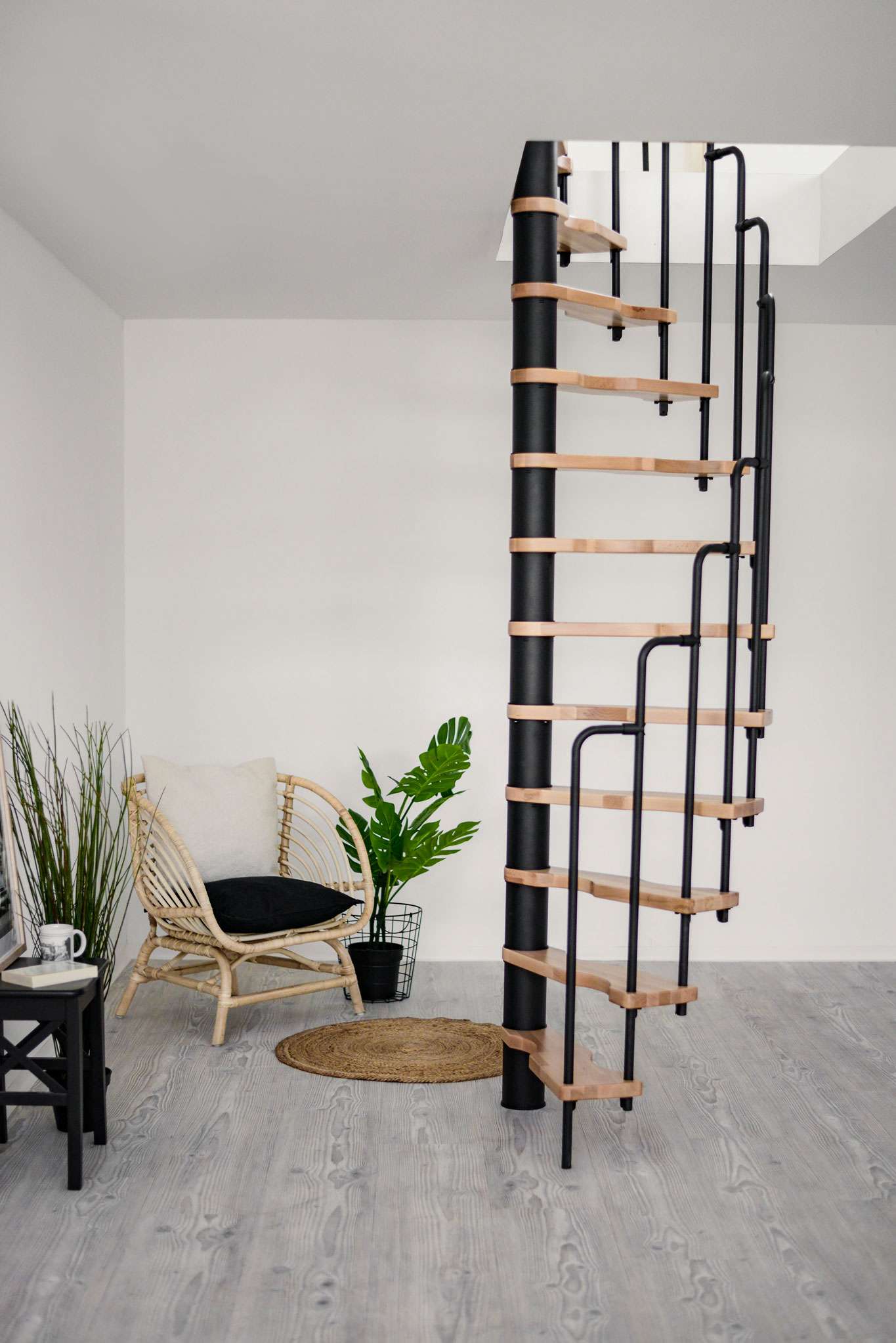 - Platzsparende Spindeltreppe mit schickem Stufengeländer