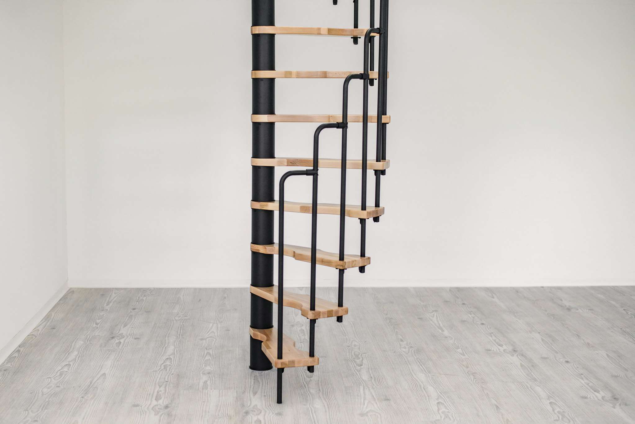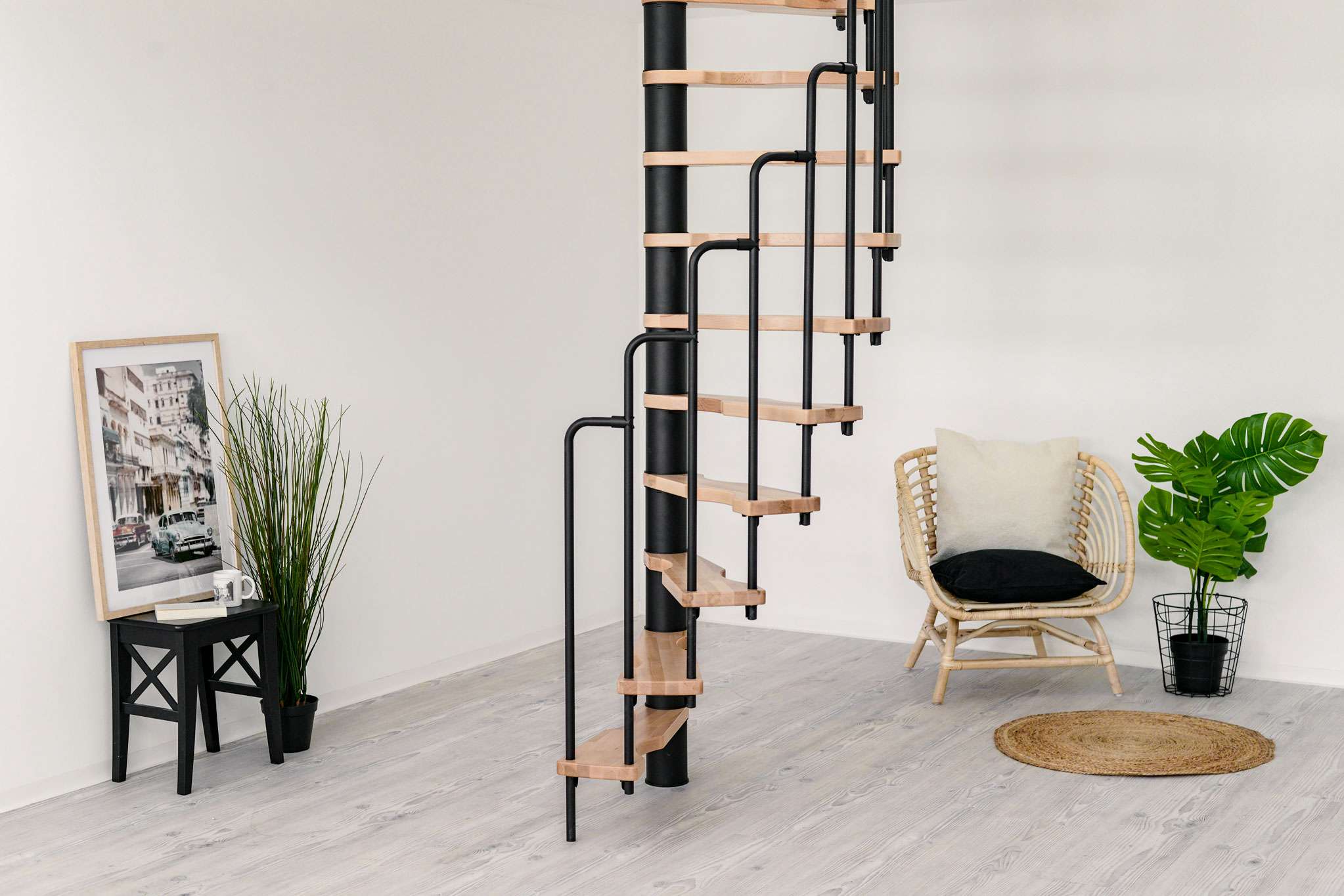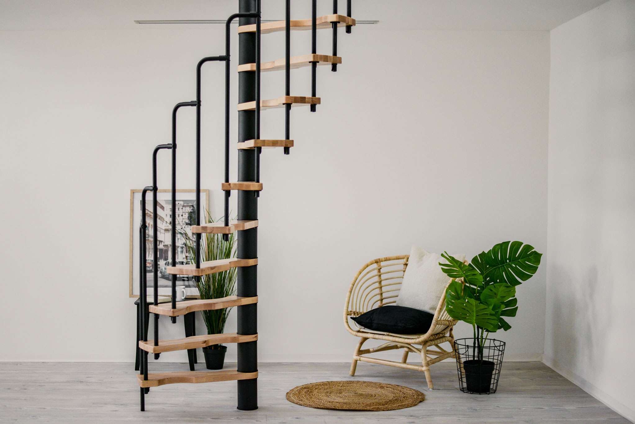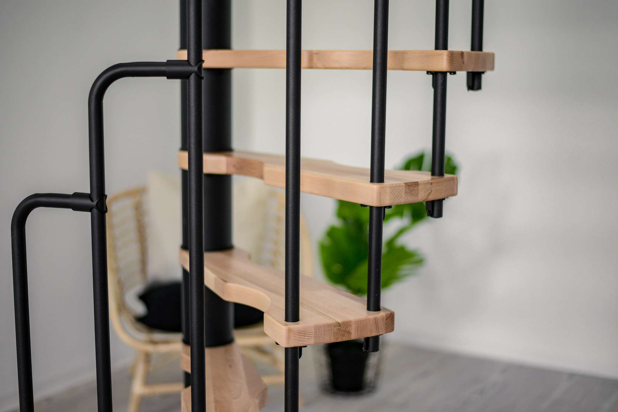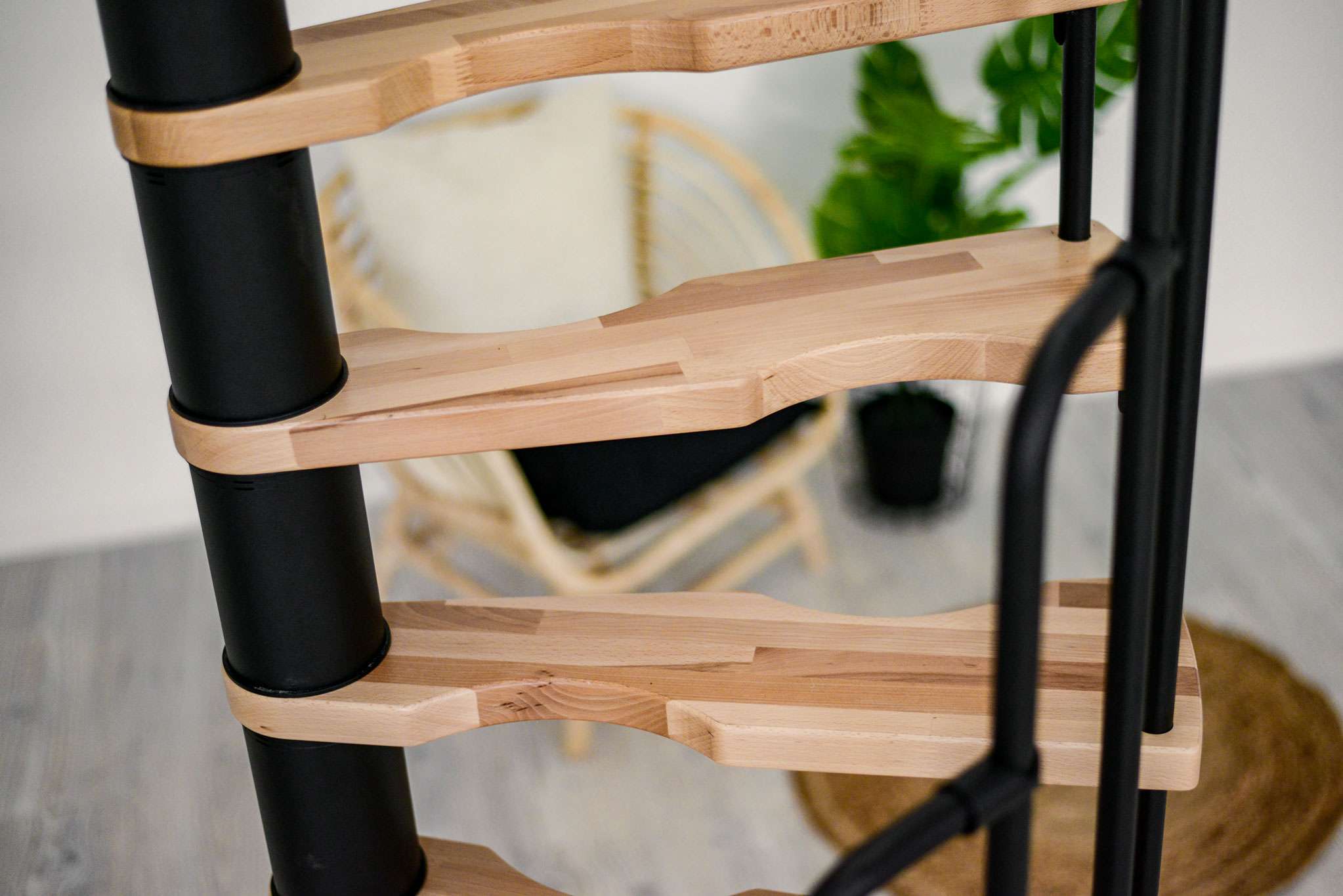 - Platzsparende Spindeltreppe mit schickem Stufengeländer