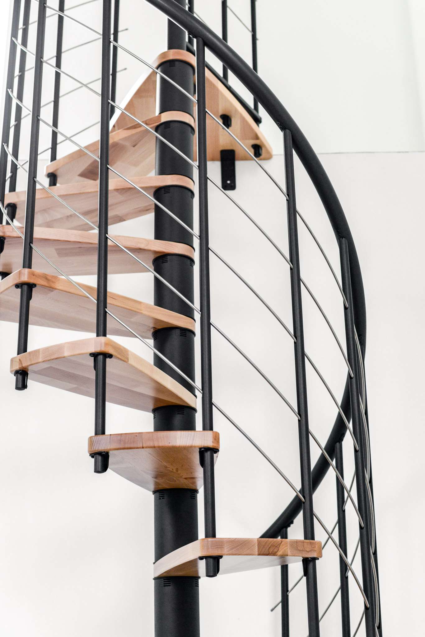 Die Venezia Smart zeichnet sich durch eine große Vielfalt an Varianten aus. Sowohl die Stufen als auch die Metallteile können farblich angepasst werden. Zur Auswahl stehen Buche, Walnuss, Eiche und Weiß für das Holz sowie Schwarz, Grau und Weiß für die Metallteile und den Handlauf. Der Handlauf der Venezia Smart besteht aus hochwertigem PVC, welcher sich angenehm in die Hand schmiegt. Diese Spindeltreppe gibt es in einem Durchmesser von 100, 120, 140 oder 160 cm.