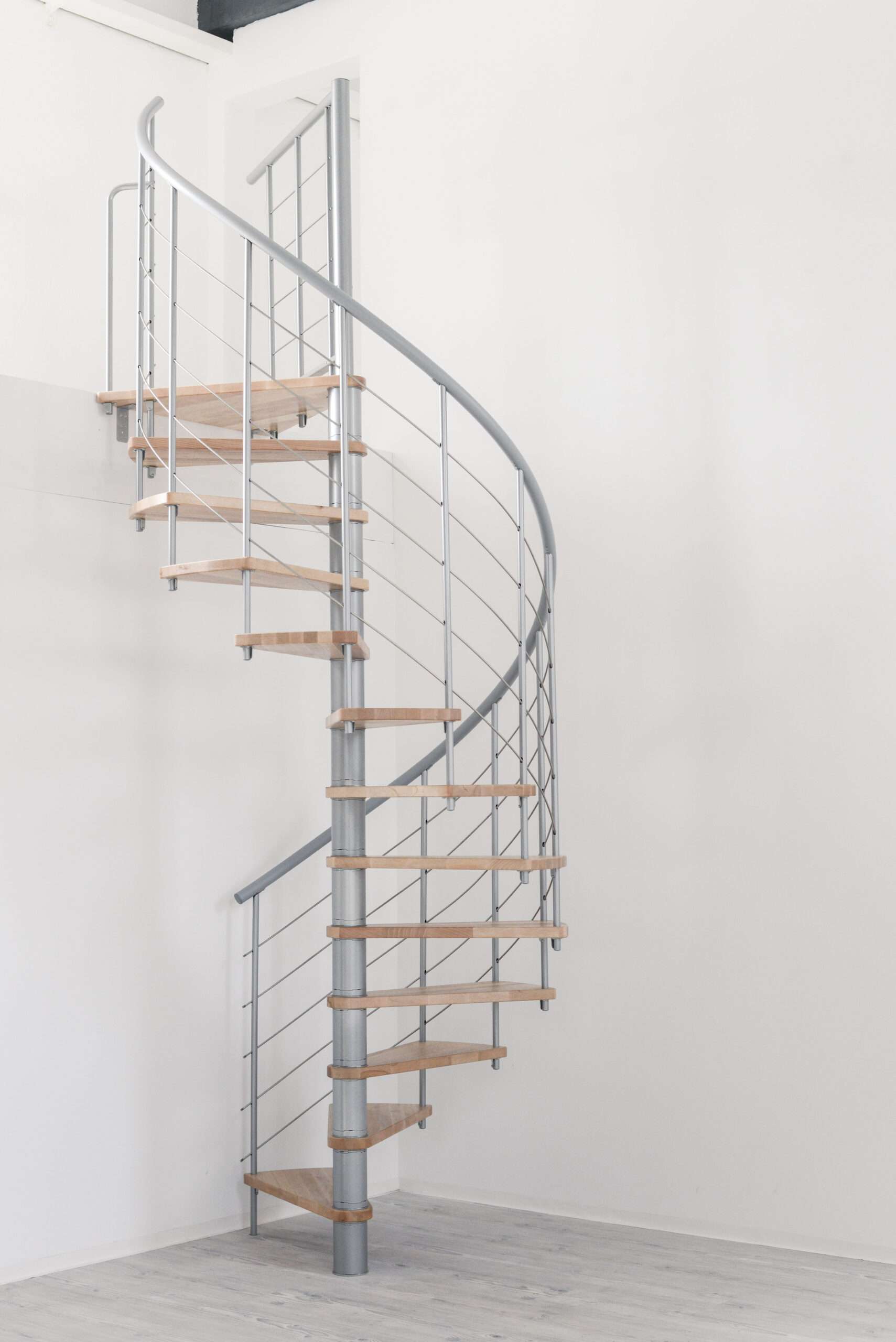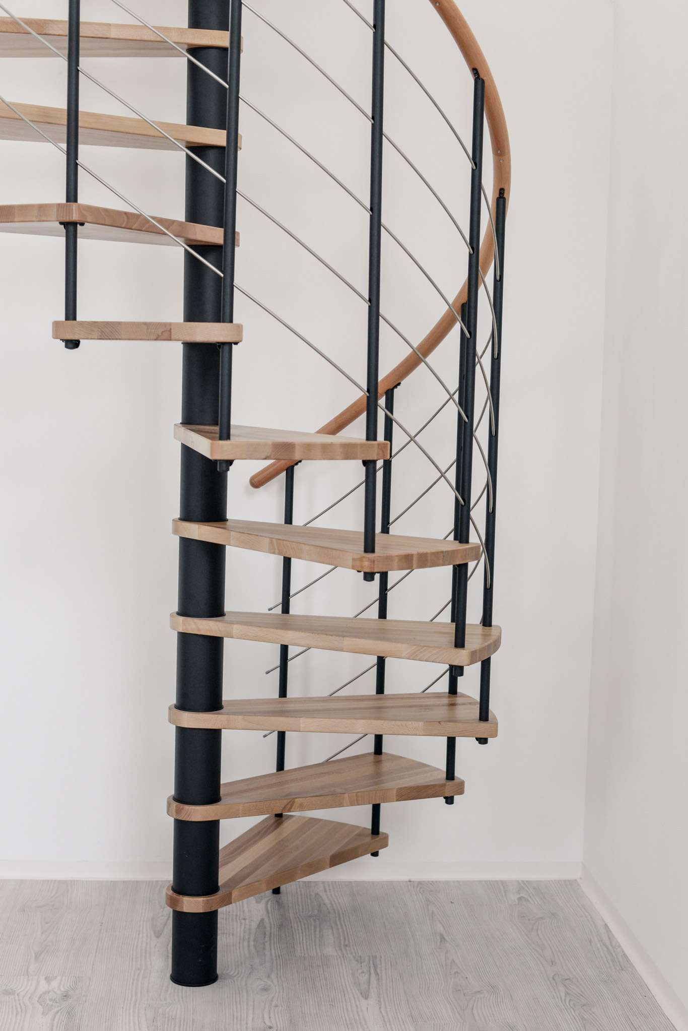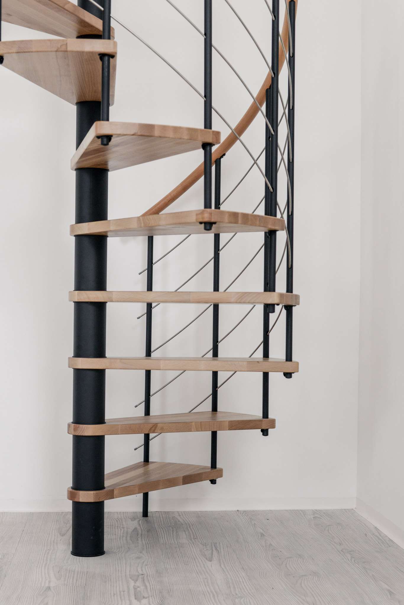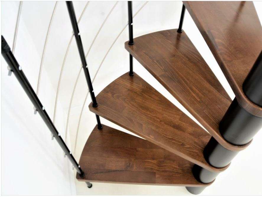 Die Spindeltreppe Venezia bietet eine besonders große Auswahl an Holzarten. Für die Stufen und den Handlauf können Sie zwischen Buche, Walnuss, Eiche und Weiß wählen und so das perfekte Match zu Ihrem Einrichtungsstil finden. Die Metallteile sind je nach Wunsch in Schwarz, Grau oder Weiß pulverbeschichtet. Auch größentechnisch bietet die Venezia mit Durchmessern von 120, 140 oder 160 cm vielfältige Möglichkeiten.