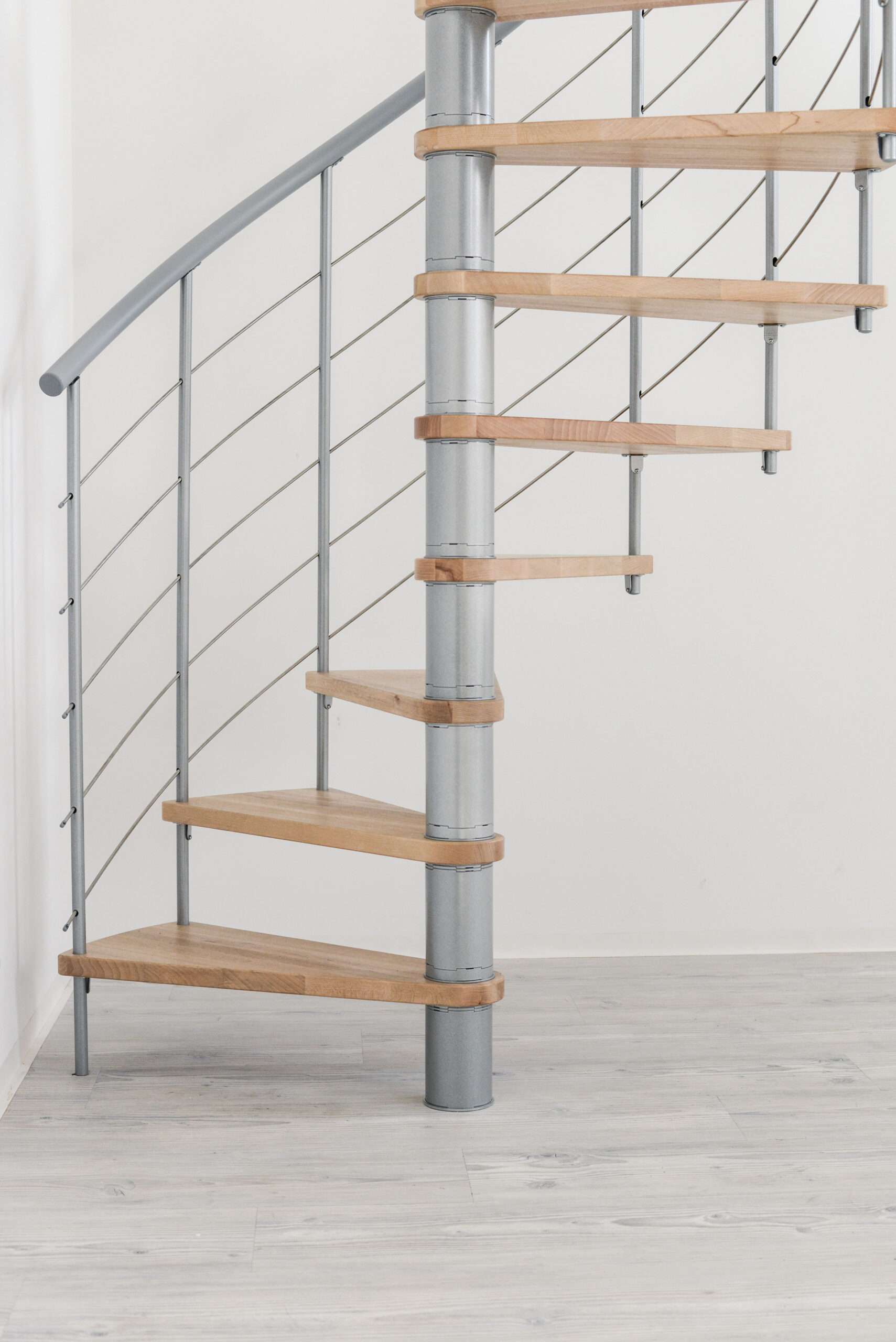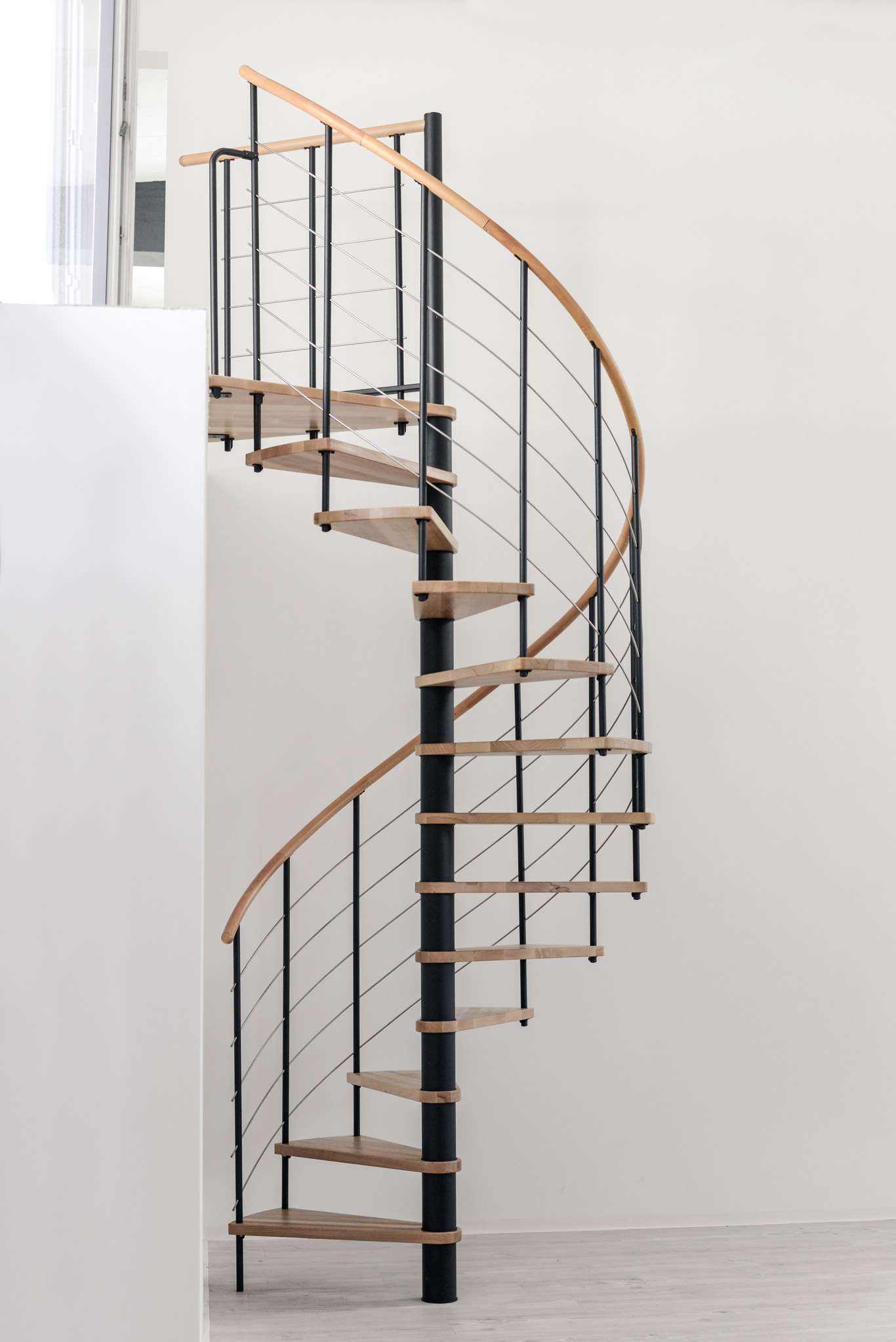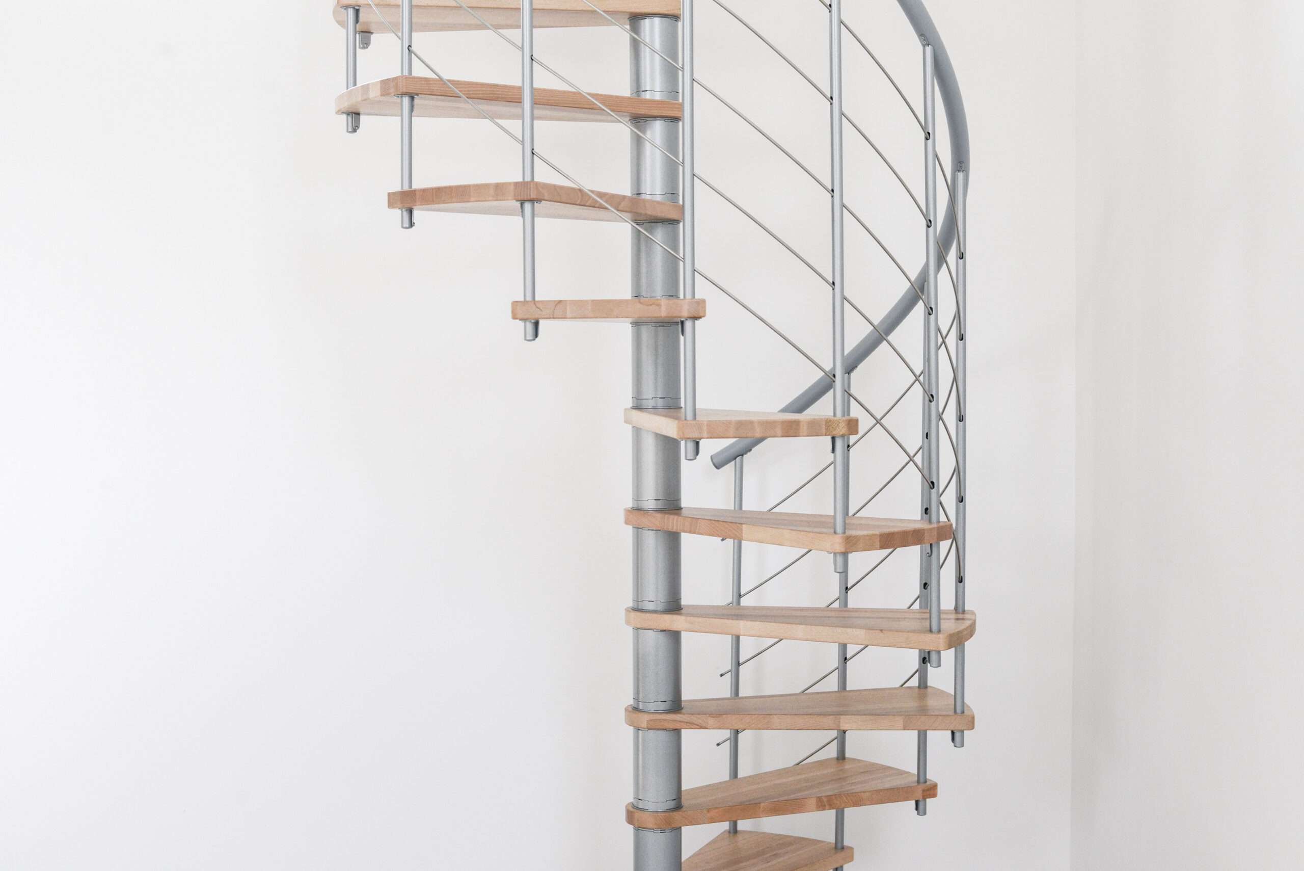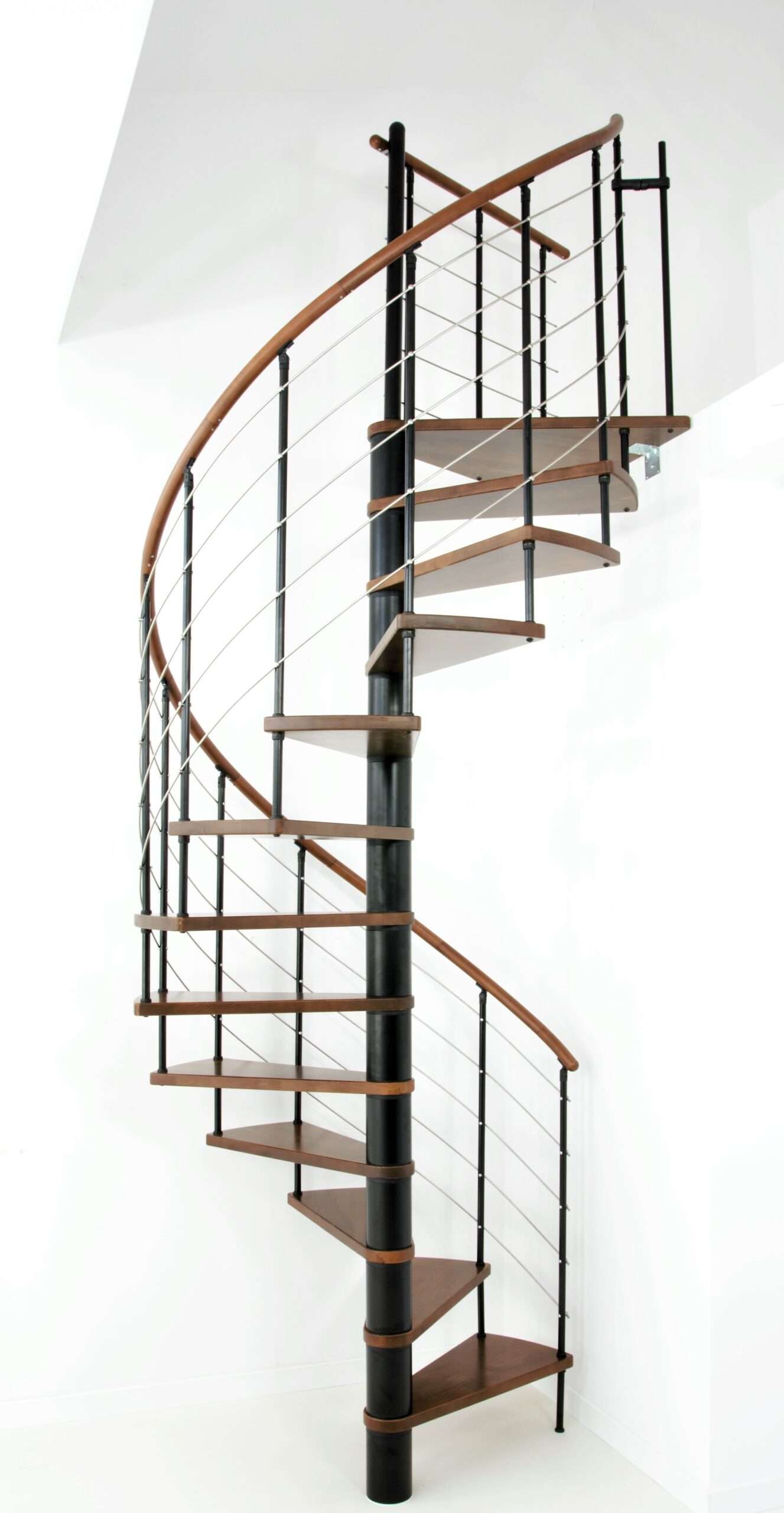 Die Spindeltreppe Venezia bietet eine besonders große Auswahl an Holzarten. Für die Stufen und den Handlauf können Sie zwischen Buche, Walnuss, Eiche und Weiß wählen und so das perfekte Match zu Ihrem Einrichtungsstil finden. Die Metallteile sind je nach Wunsch in Schwarz, Grau oder Weiß pulverbeschichtet. Auch größentechnisch bietet die Venezia mit Durchmessern von 120, 140 oder 160 cm vielfältige Möglichkeiten.